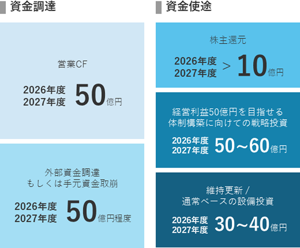 - それに伴い、従来提示していたキャピタルアロケーション計画を大きく見直し。戦略投資は今後2年で50~60億円を想定。必要資金は財務健全性を維持しつつ、外部資金を積極的に活用する方針